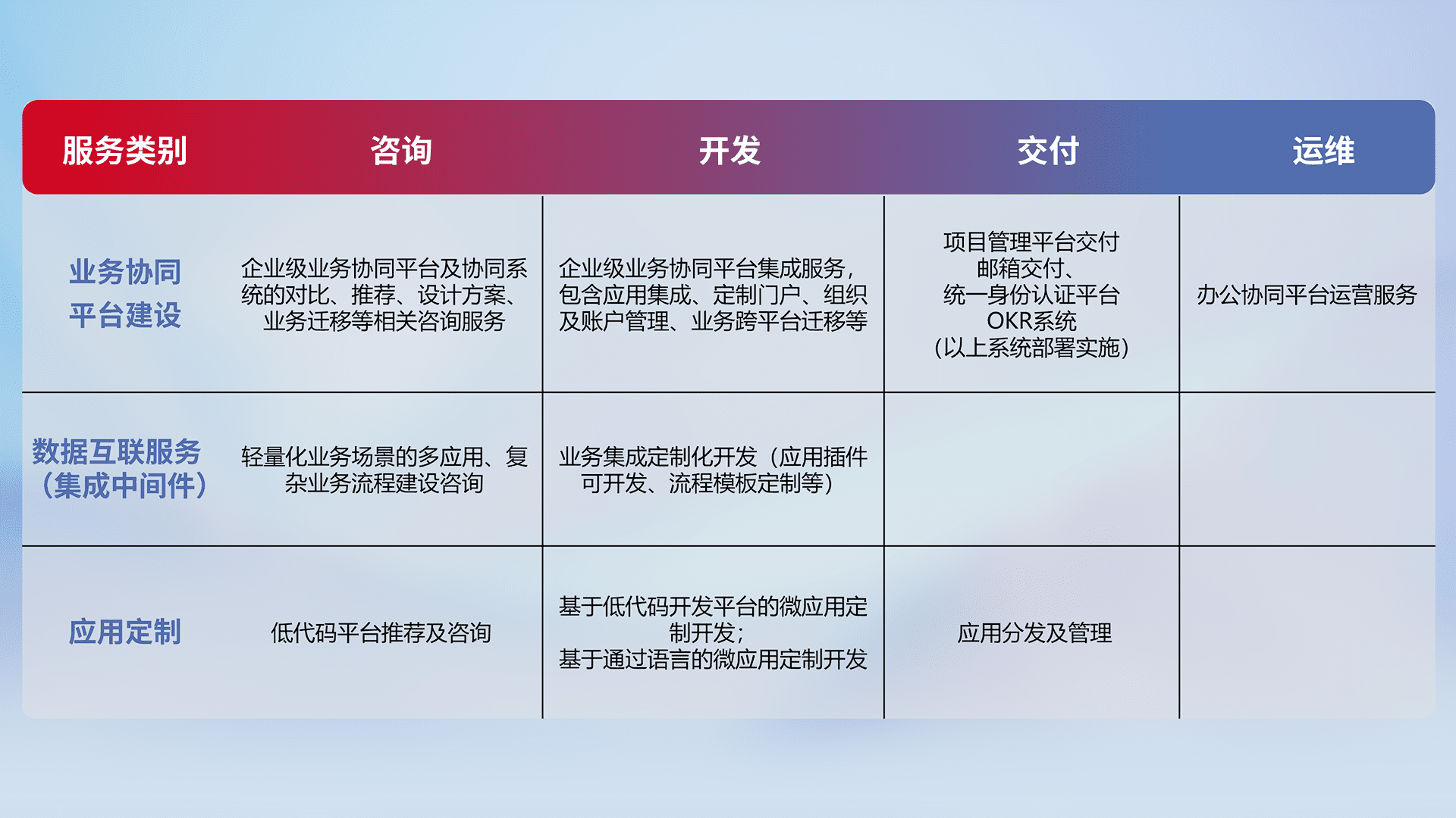 针对钉钉、、、企微、、、、IDaas等平台级产品提供产品的规划、、方案、、交付、、、定制化开发等服务,,,,实现如统一协同办公、、、、智能客户服务、、、、混合会议管理、、智能数据查询、、、等业务场景,,,,实现数字化转型。。。。